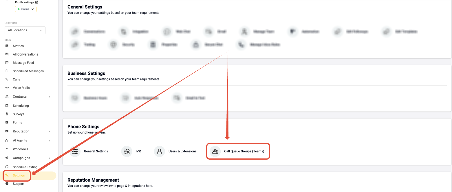 To access Call Queue Groups (Teams), go to Settings from the left-hand sidebar >> select Call Queue Groups (Teams) under Phone Settings.