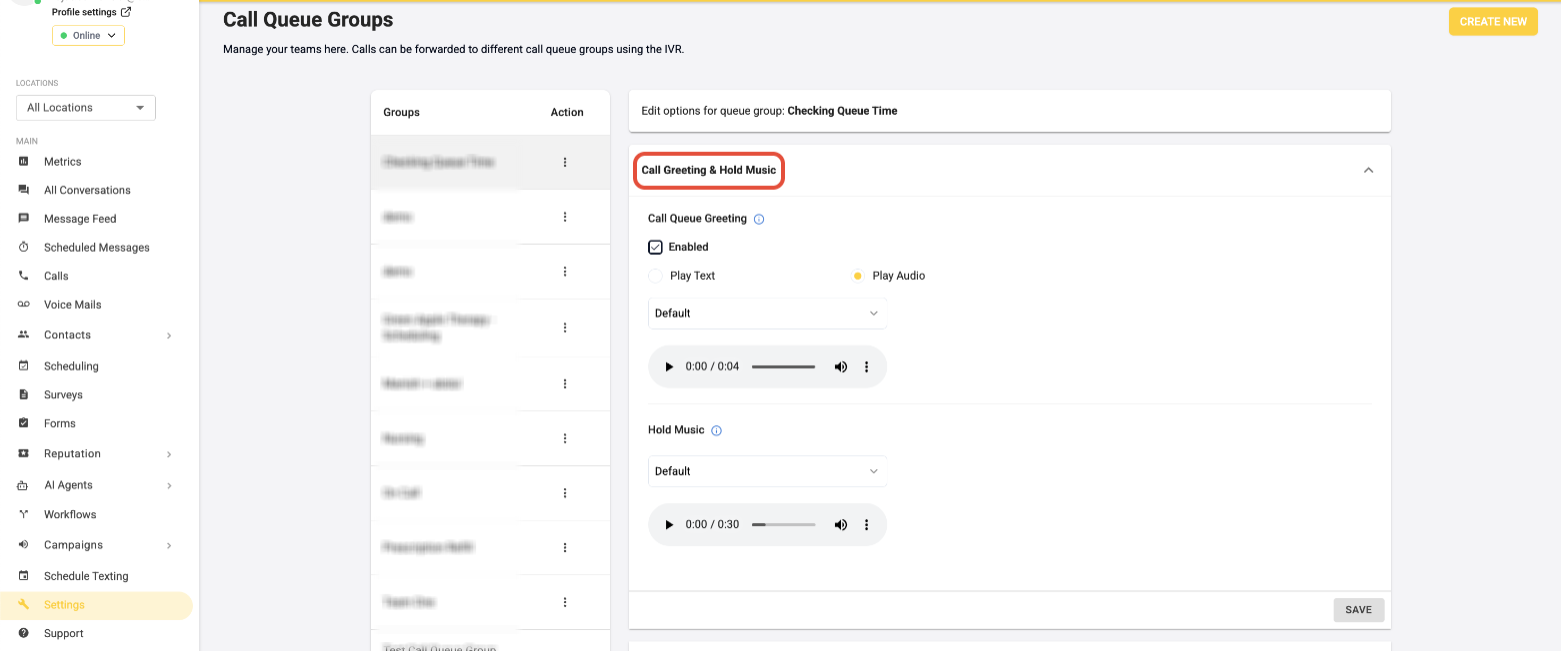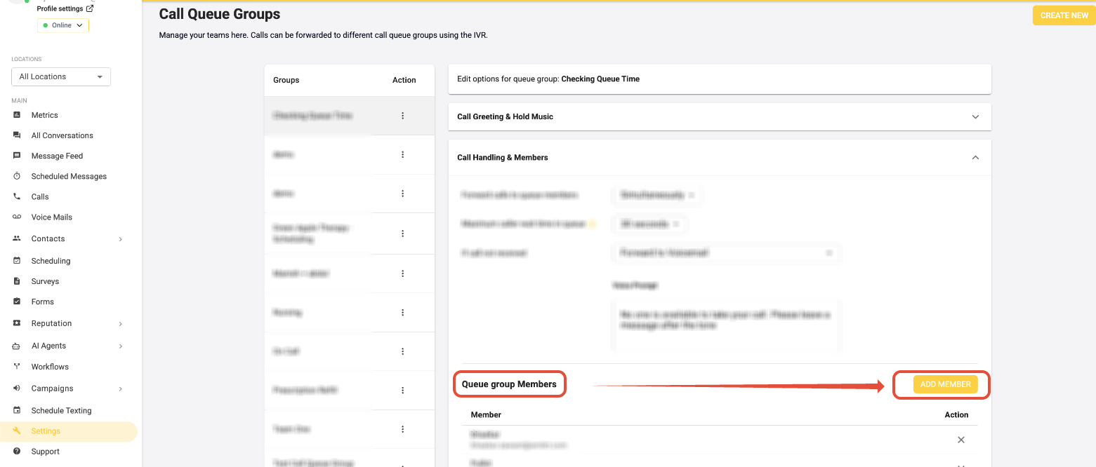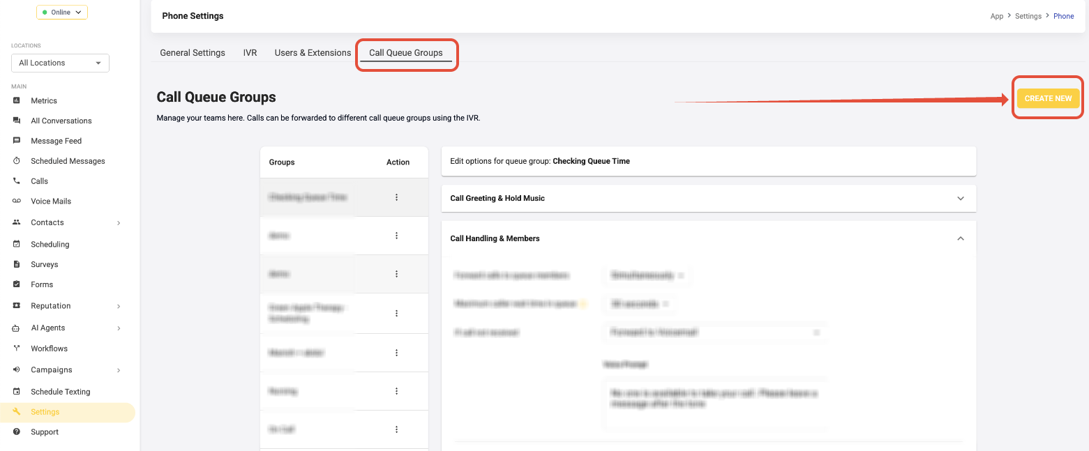 To create a new call queue group, click the Create New button in the top-right corner >> Enter the name of the call queue group >> Click Create.