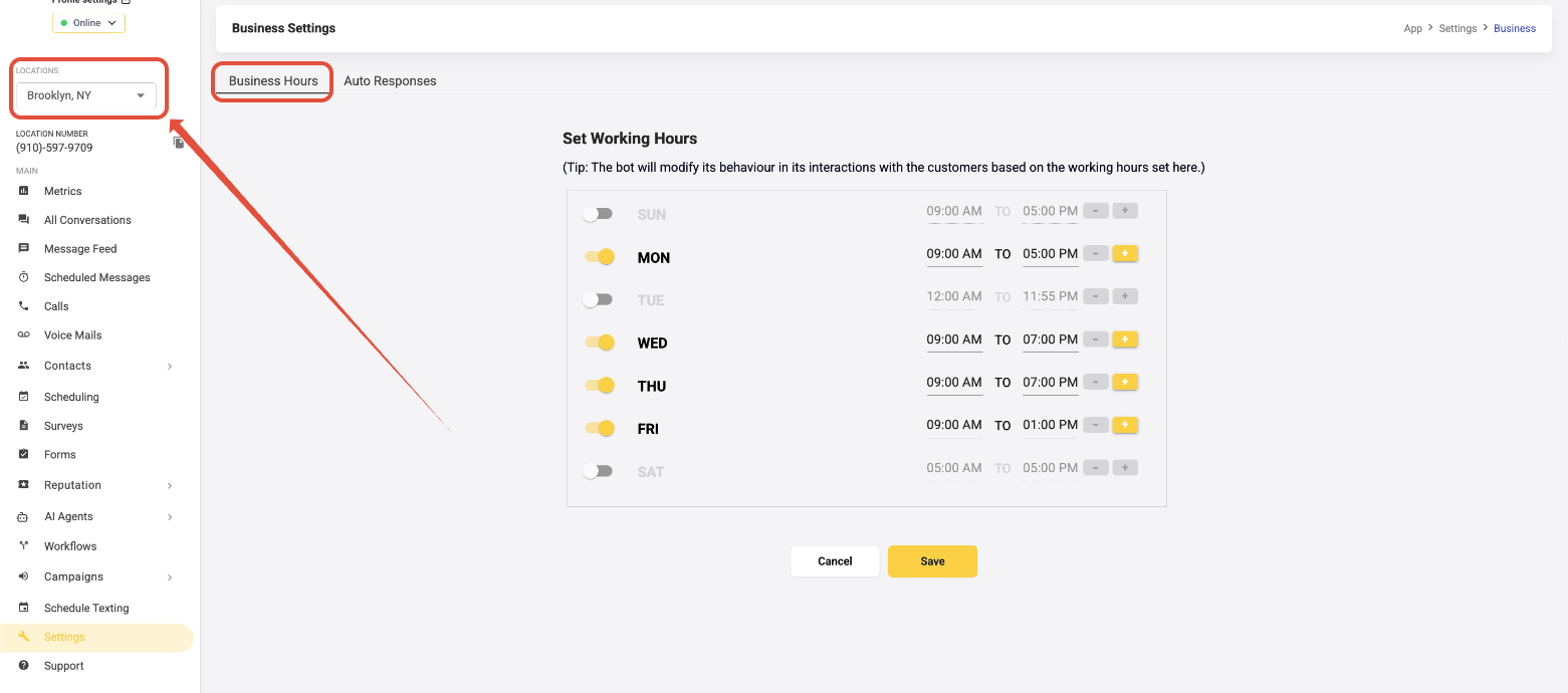 From the left-hand sidebar, choose the location you want to manage >> adjust the business hours as needed and click Save to apply your changes.
