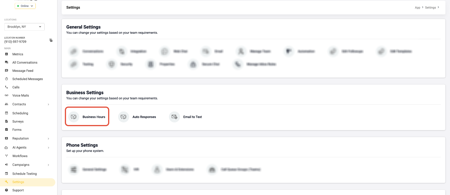 To access your Business Hours settings, go to Settings from the left-hand sidebar >> select Business Hours under Business Settings.