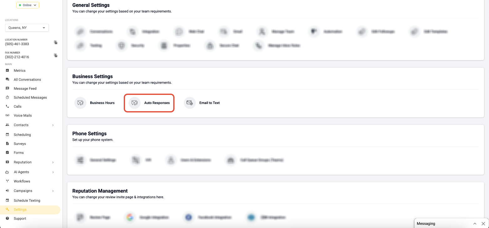 To access and manage auto responses, go to Settings from the left-hand sidebar >> Under Business Settings, select Auto Responses.