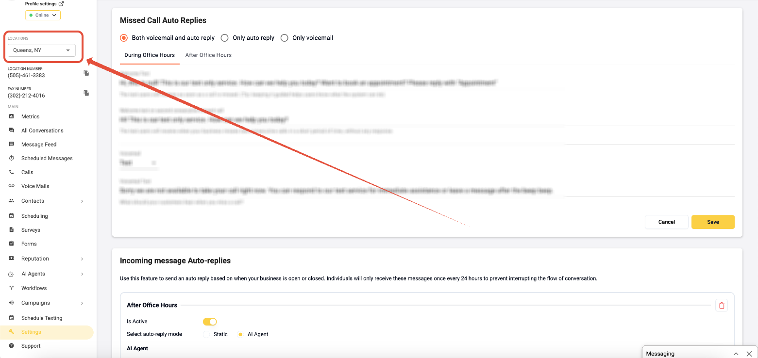 From this page, you can select the Location from the left hand side bar and configure multiple types of automated replies to suit your business needs.